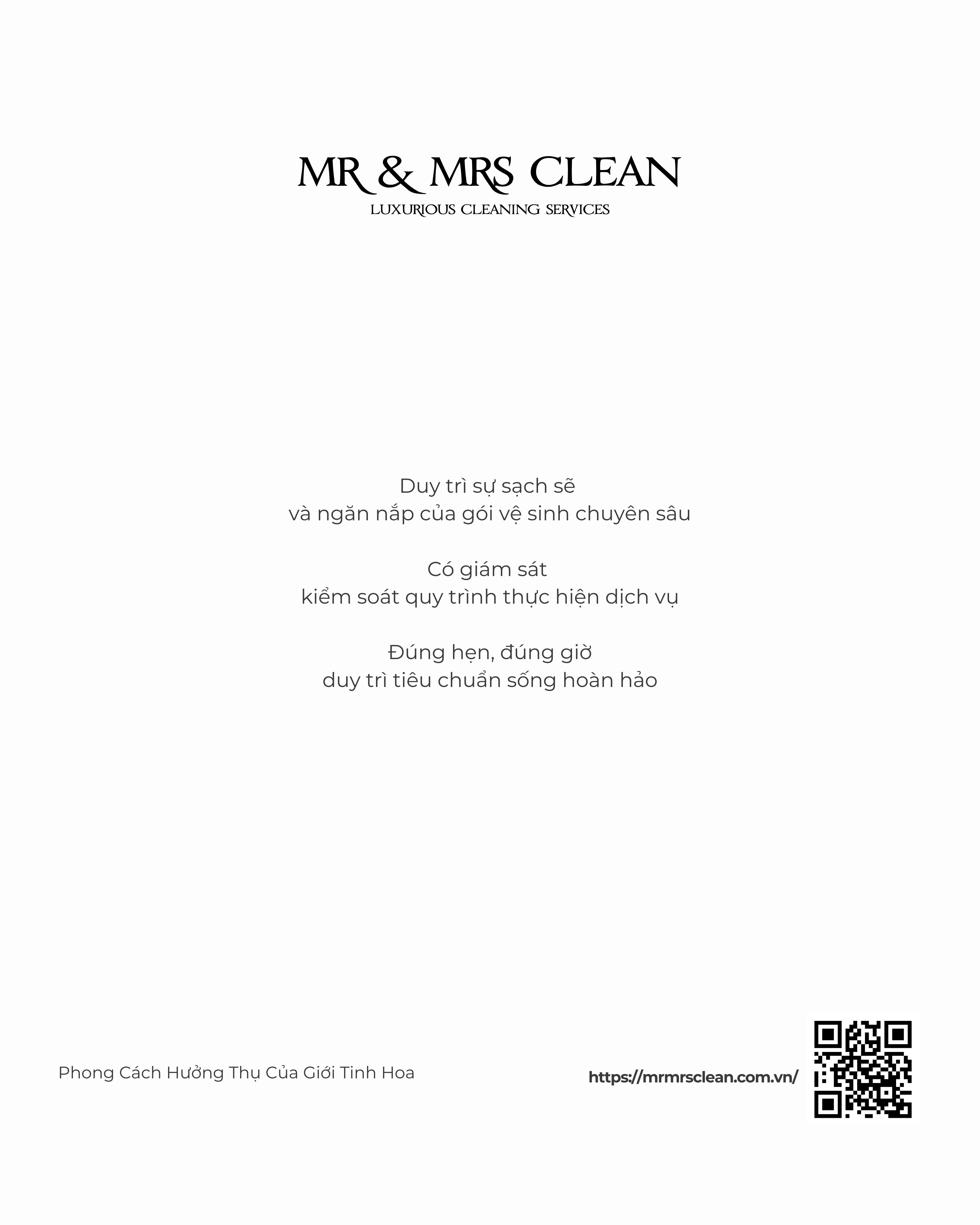 Với MR & MRS CLEAN, Vệ sinh định kỳ không chỉ duy trì sự sạch sẽ, mà còn khẳng định đẳng cấp không gian sống của gia chủ – luôn tinh khiết, ngăn nắp và sang trọng trong từng chi tiết.